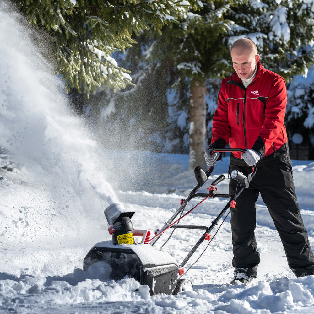 Die Akku-Schneefräse arbeitet äußerst wendig und leise. Mit einer einzigen Akkuladung kannst du bis zu 200-300 m² räumen – mit einem zusätzlichen Akku sogar noch mehr. Durch das geringe Gewicht (nur etwa 15 kg) und den praktischen LED-Scheinwerfer macht der Winterdienst selbst bei Dunkelheit richtig Freude. Besonders vorteilhaft: Die Akku-Schneefräse lässt sich ohne Werkzeug in wenigen Schritten montieren, ist flexibel auf deine Körpergröße anpassbar und kann platzsparend verstaut werden.