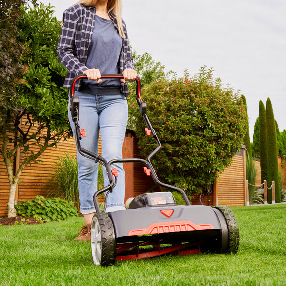 Du kannst die Höhe der Grashalme in vier Stufen einstellen. Zur Wahl stehen Höhen zwischen 14 und 38 Millimetern. Der Akku Spindelmäher arbeitet auf einer Breite von 38 Zentimetern und ist mit Rädern ausgestattet, die einen Durchmesser von 20 Zentimetern aufweisen.